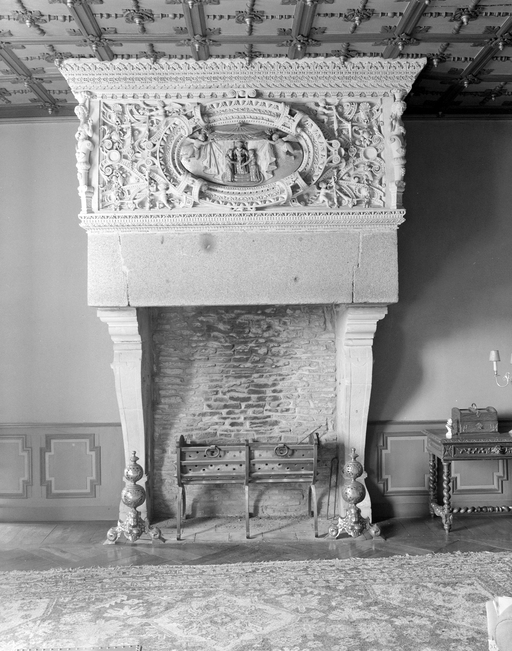 Salle à l'étage : vue générale de la cheminée sculptée.Immatriculation