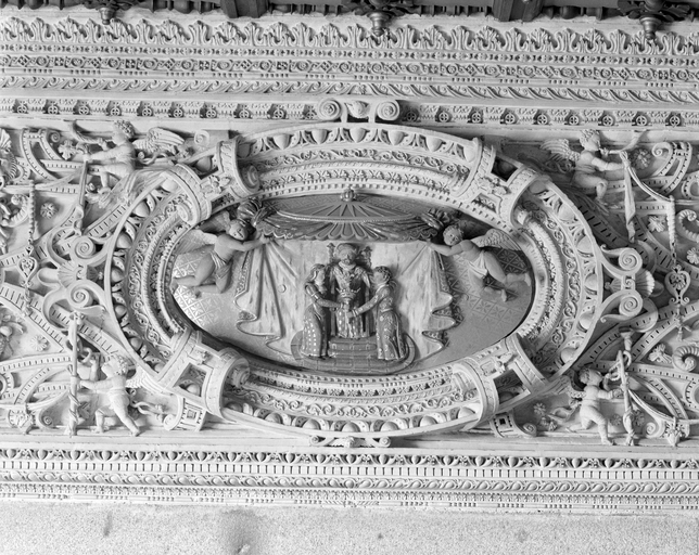 Salle à l'étage : cheminée, détail du cartouche central.Immatriculation