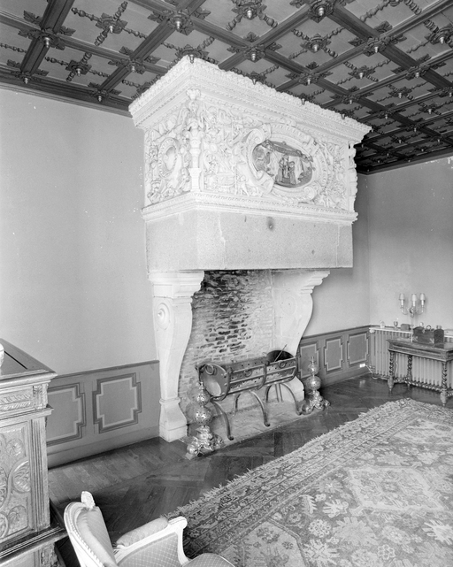 Salle à l'étage : vue générale de la cheminée, de biais.Immatriculation