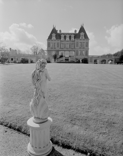 Vue d'ensemble de la façade sur jardin prise de face avec sculpture.Immatriculation