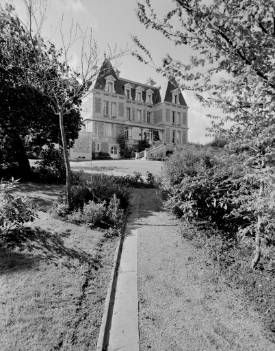Vue d'ensemble de la façade sur jardin prise de profil avec allée et plantations.Immatriculation