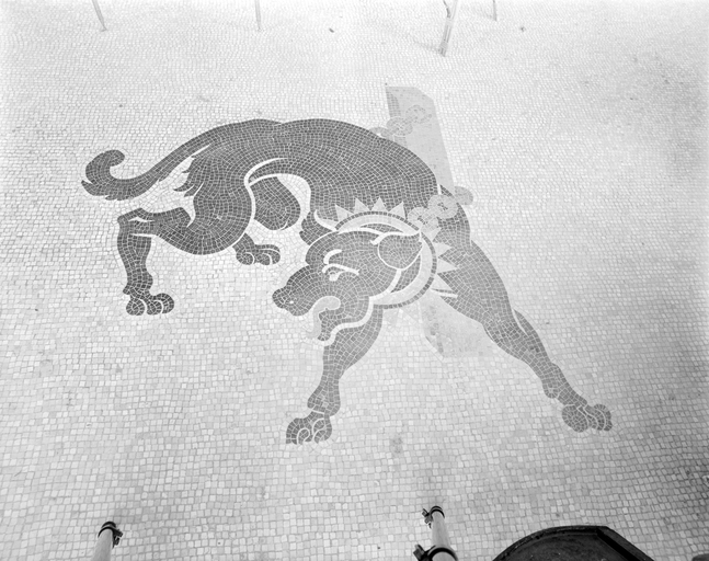 Jardin d'hiver : décor de mosaïque, détail du chien.Immatriculation