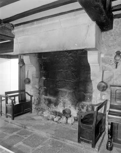 Vue générale de la cheminée, salle n°1, rez-de-chaussée avec partie basse ancienne.Immatriculation