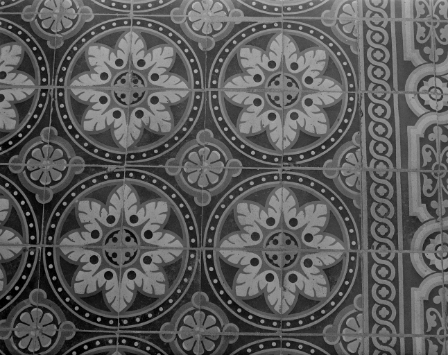Détail de la mosaïque (fond mosaïque au-dessus de la citerne).Immatriculation