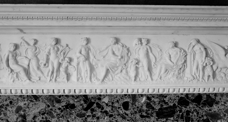 Détail sculpté de la partie haute de la cheminée de la salle à manger.Immatriculation
