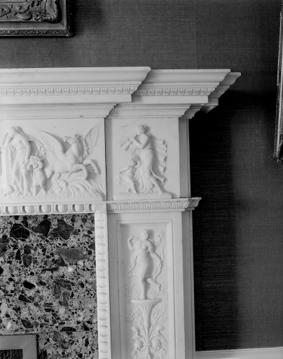Détail décor sculpté de la partie droite de la cheminée de la salle à manger.Immatriculation