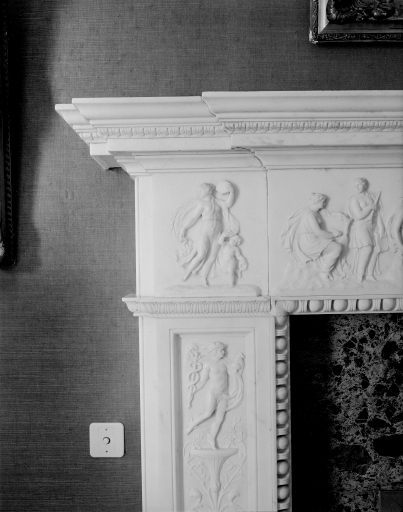 Détail décor sculpté de la partie gauche de la cheminée de la salle à manger.Immatriculation