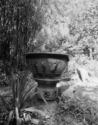 Vue rapprochée de la vasque avec détails du décor et du pied.Immatriculation