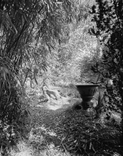Vue générale du jardin japonais avec la vasque.Immatriculation