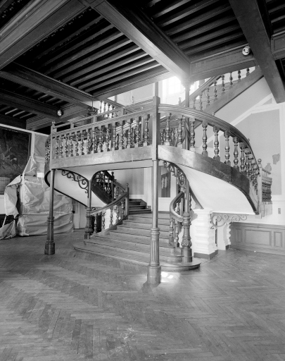 Vue générale de l'escalier central du hall d'entrée.Immatriculation