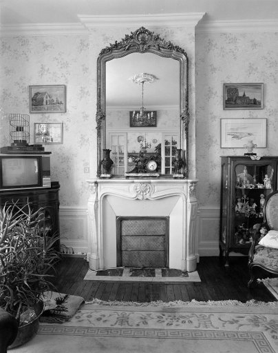 Vue générale de la cheminée en marbre du salon.Immatriculation