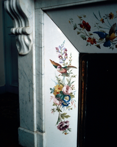 Détail décor sur cheminée rez-de-chaussée, bouquets et oiseaux en porcelaine peinte.Immatriculation
