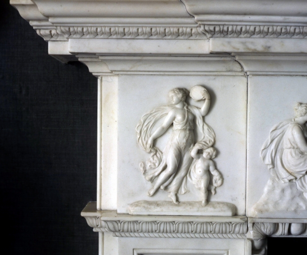 Détail du décor sculpté à l'angle supérieur gauche de la cheminée.Immatriculation