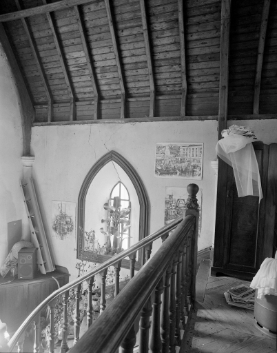 Vue du palier du 1er étage et de la rampe d'escalier avec décor mural : miroir et tableaux.Immatriculation