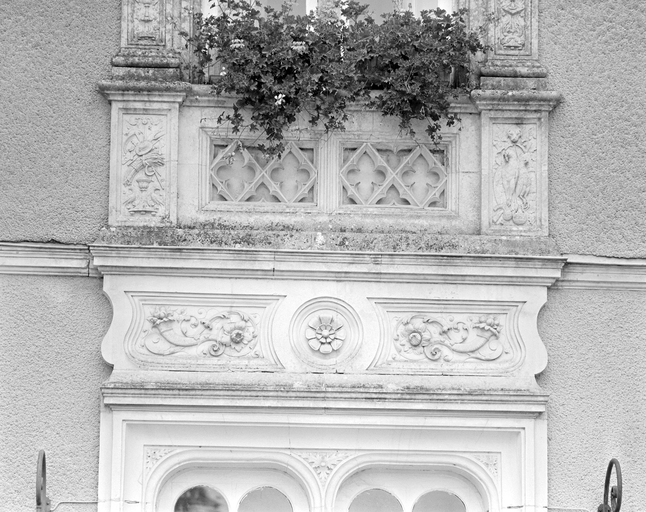 Elévation sud, travée centrale, détail de la sculpture au pied de la fenêtre centrale : attributs de l'agriculture.Immatriculation