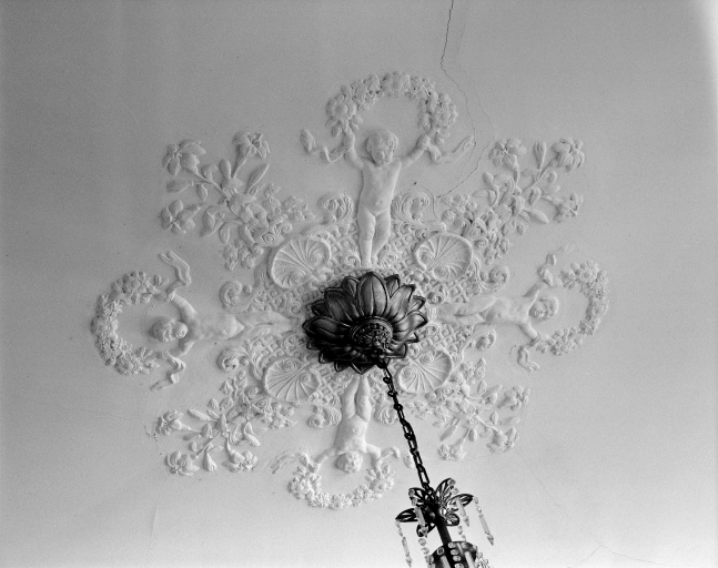 Vue générale d'une rosace plafond avec anges dans la salle à manger.Immatriculation