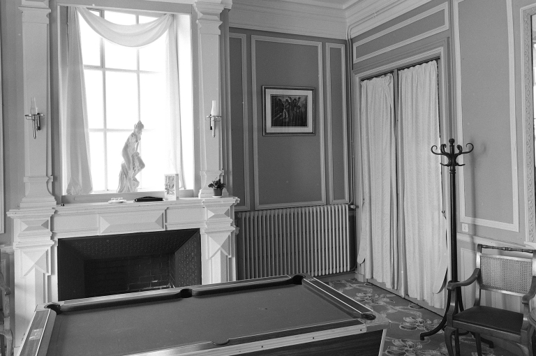 Vue générale de la salle de billard avec cheminée.Immatriculation