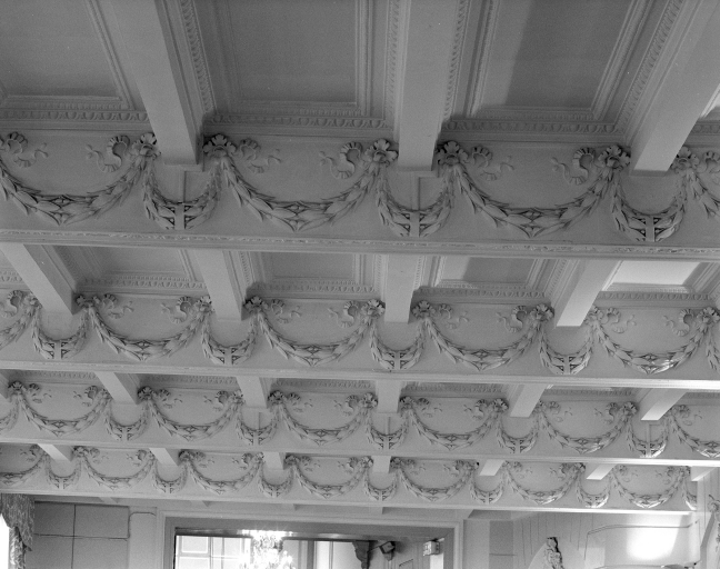Vue générale du décor sculpté plafond du hall-salon.Immatriculation