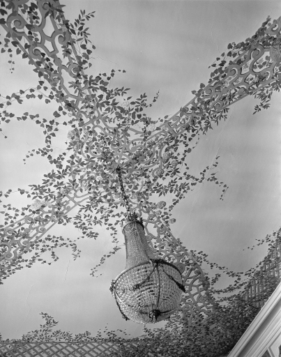 Décor plafond, vue générale de la partie centrale avec le lustre.Immatriculation