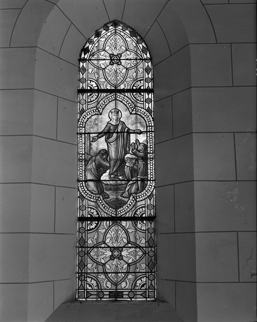 Verrières (4) (verrière mariale) : vie de la Vierge (baies 1 à 4), chapelle Sainte-Marie-de-la-Moisson (Val-d'Izé),