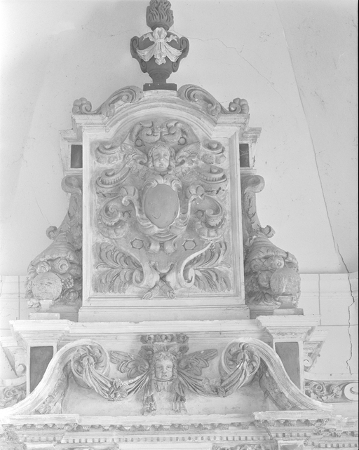 Retable, détail du couronnement.Immatriculation