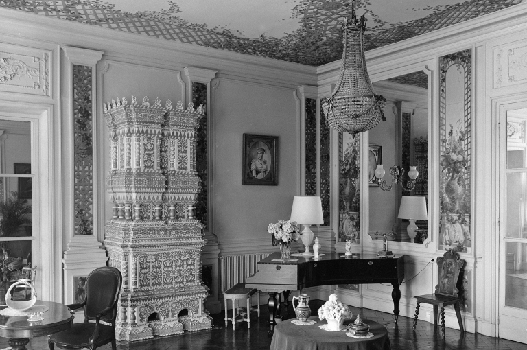 Salon, vue d'ensemble de la pièce avec le poêle.Immatriculation