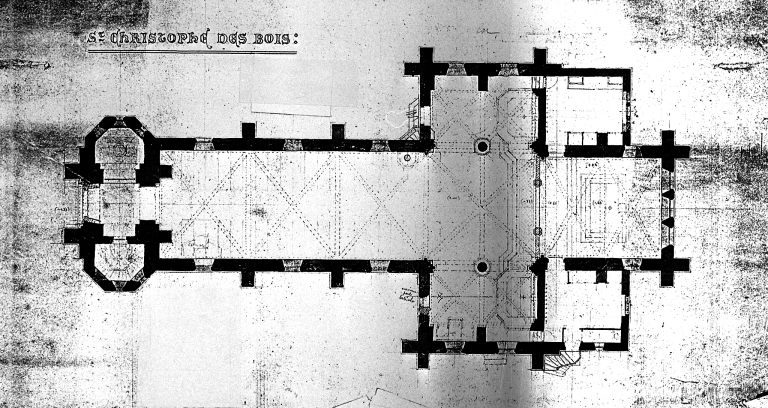 Plan au sol de l'église. Crayon de papier et lavis rouge sur papier, par A. Regnault.Immatriculation