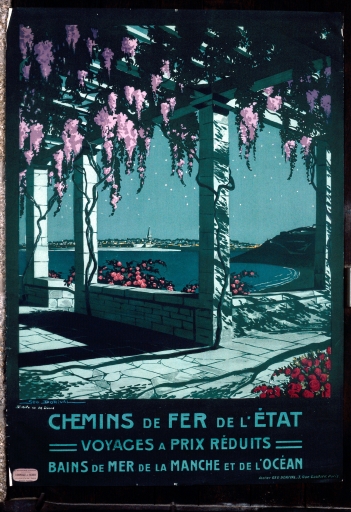 Chemin de fer de l'Etat voyages à prix réduits, affiche grand format en couleur, par Dorival.Immatriculation