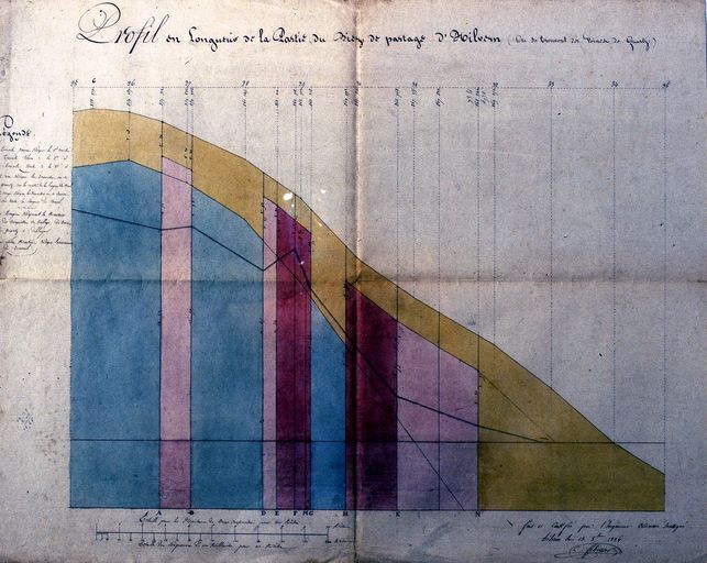 Profil en longueur de la partie du bief de partage d'Hilvern (où se trouvent des veines de quartz). Dessin, par C. Febvrier, ingénieur ordinaire des Ponts et Chaussées, le 13 octobre 1826 ; échelle : 1 : 50.