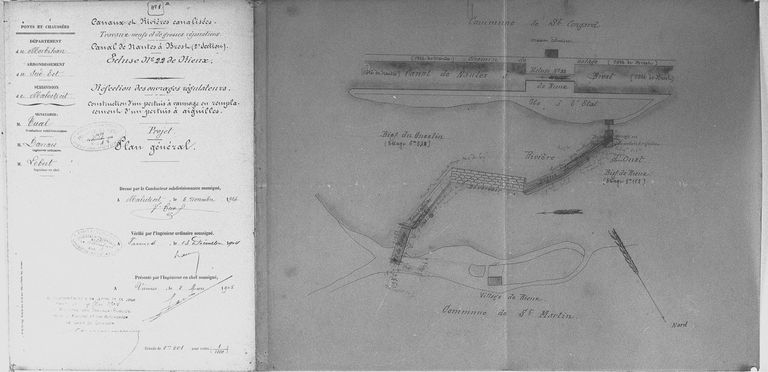 Canaux et Rivières canalisées. Travaux neufs et de grosses réparations. Canal de Nantes à Brest (2e section). Écluse n°22 de Rieux. Réfection des ouvrages régulateurs. Construction d'un pertuis à vannage en remplacement d'un pertuis à aiguilles. Projet. Plan général. Dessin, par Tual, conducteur subdivisionnaire des Ponts et chaussées, 5 novembre 1904. Papier, encre, aquarelle, 31x42 ; échelle : 1 : 1000.