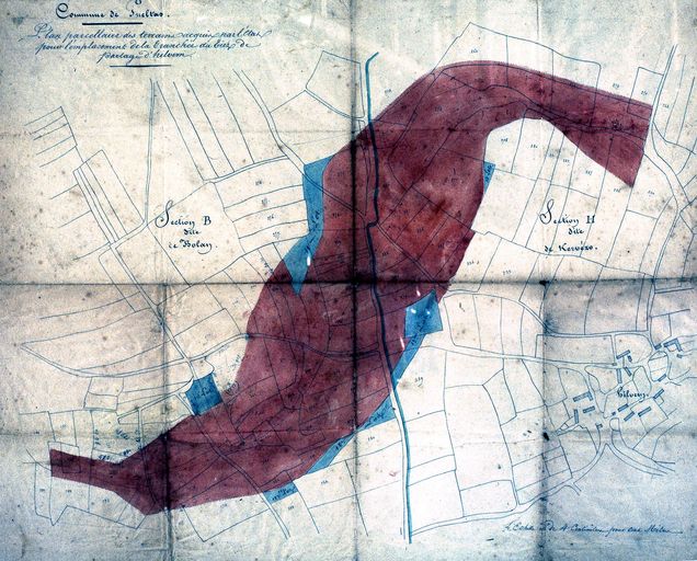 Commune de Gueltas. Plan parcellaire des terrains acquis par l’État pour l'emplacement de la tranchée du biez de partage d'Hilvern. Carte, [s. n. ; s. d.]. Papier, encre, aquarelle ; échelle : 1 : 2500.