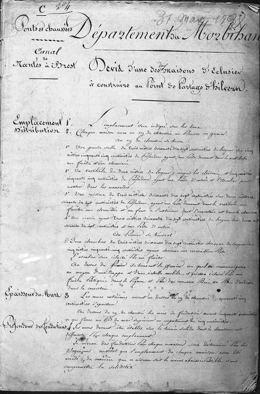 Devis de construction d'une des deux maisons d'éclusier à construire au point de partage d'Hilvern, 31 mars 1825 (D. D. E. Morbihan, Pontivy)Immatriculation