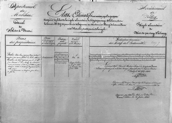 Département du Morbihan. Canal de Nantes à Brest. Rigole alimentaire du bief de partage d'Hilvern. État estimatif d'une maison que l'on propose d'acquérir sur le bord de la rigole alimentaire du biez de partage d'Hilvern entre les bornes n° 13 et 14 pour servir de logement au cantonnier chargé de la surveillance et de l'entretien de cette partie de la rigole. Document, par Faivre, faisant office d'ingénieur ordinaire des Ponts et Chaussées, 26 juin 1843, approuvé par l'ingénieur en chef C. Febvrier.