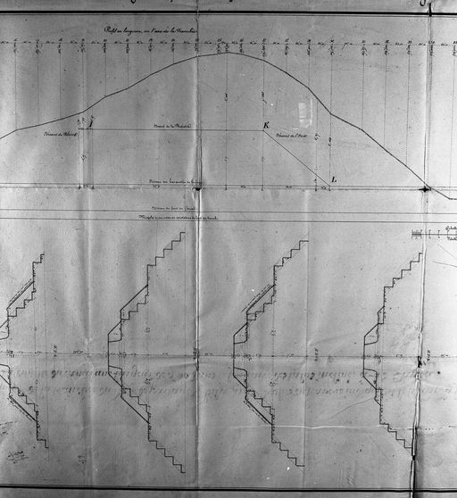 Profils en longueur et en travers indiquant le travail à faire pour la cuvette du canal, 1839 : vue rapprochée (DDE Morbihan, Pontivy)Immatriculation