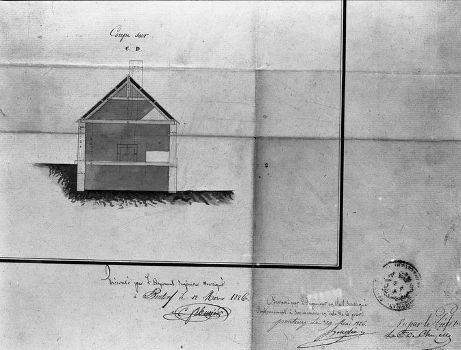 Projet de maison d'éclusier, 12 mars 1826 : coupe transversale et signatures (D. D. E. Morbihan, Pontivy)Immatriculation