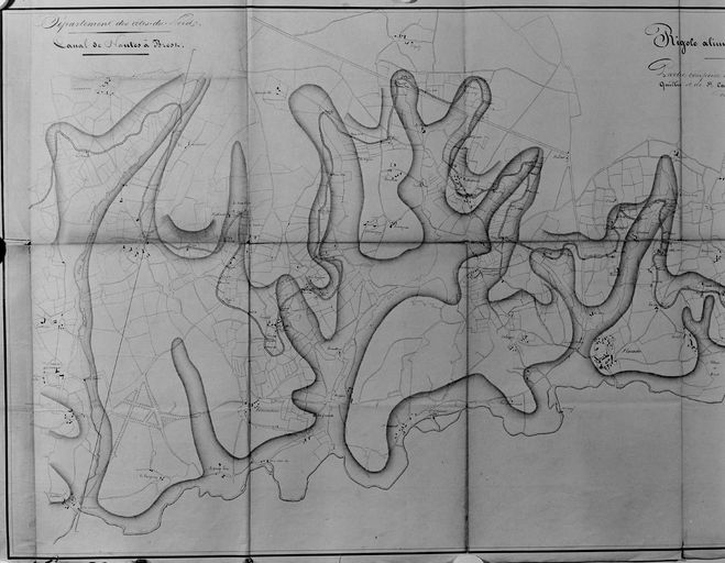 Tracé de la rigole entre le ruisseau de Guernay et le ruisseau des Fontaines, 22 janvier 1844 : partie gauche de la carte 2 (D. D. E. Morbihan, Pontivy)Immatriculation