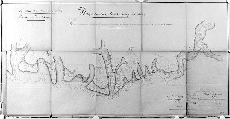 Tracé de la rigole entre le réservoir de Bosméléac et le ruisseau de Guernay, 22 janvier 1844 : vue générale de la carte 1 (D. D. E. Morbihan, Pontivy)Immatriculation