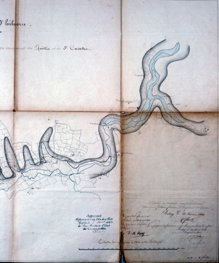 Département des Côtes-du-Nord. Canal de Nantes à Brest. Rigole alimentaire du bief de partage d'Hilvern. Partie comprise entre le réservoir de Bosméléac et le ruisseau de Guernay, limite des communes du Quillo et St-Caradec. Carte [=carte 1], par Faivre, conducteur faisant office d'ingénieur ordinaire des Ponts et chaussées, 22 janvier 1844, échelle : 1 : 10000. Papier, encre, aquarelle.