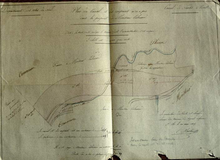 Plan du canal et des emprunts qu'on a pris dans la propriété de Monsieur Calenard. Carte, par E. Martin, conducteur des Ponts et Chaussées, 1835 ; échelle : 1 : 2000. Papier, encre, aquarelle.