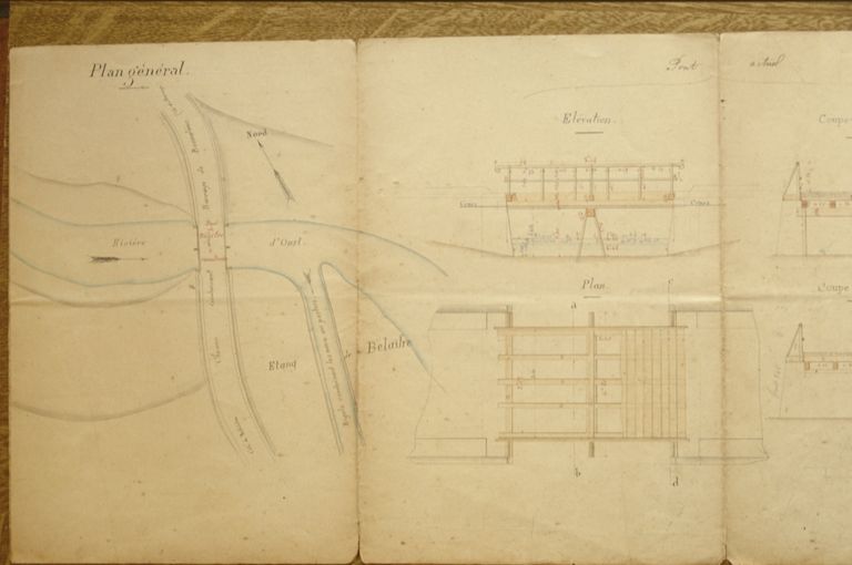 [Plan général du pont de Belaître à reconstruire. Pont actuel : élévation, plan, coupes. Pont projeté : élévation, plan, coupes]. Dessin, [s. n. ; s. d.]. Papier, encre, aquarelle.