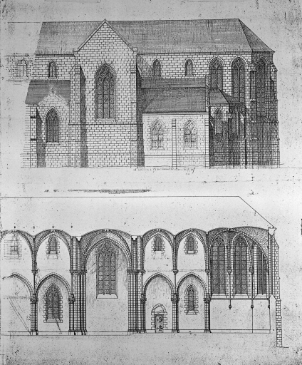 Coupe longitudinale partielle de la nef (deux travées), du transept et du choeurImmatriculation
