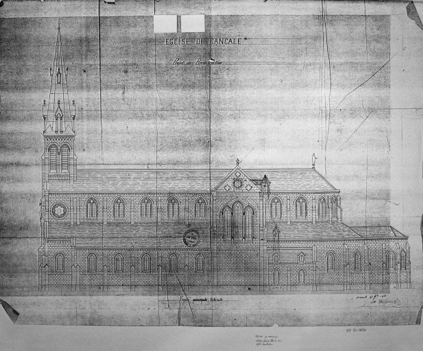 Plan dressé par A. Frangeul en 1878 pour le projet de reconstruction de l'église, élévation de la façade latéraleImmatriculation