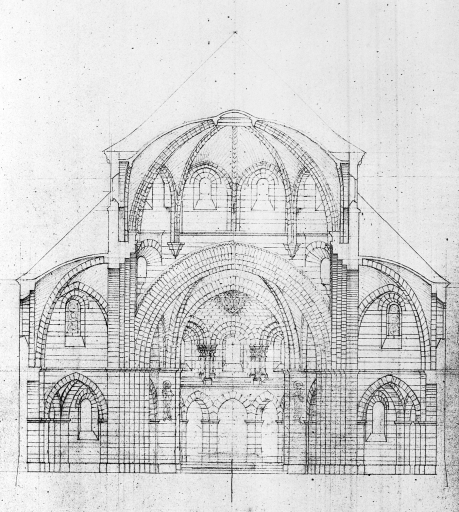Projet pour l'église de Tinténiac : coupe transversale au niveau de la croisée de transept vers le chevet, dessin par Arthur RegnaultImmatriculation