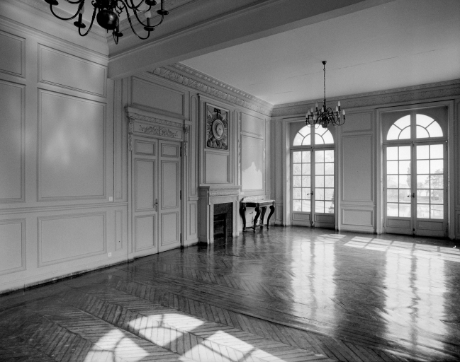 Vue intérieure du petit salon avec portes-fenêtres et cheminée.Immatriculation