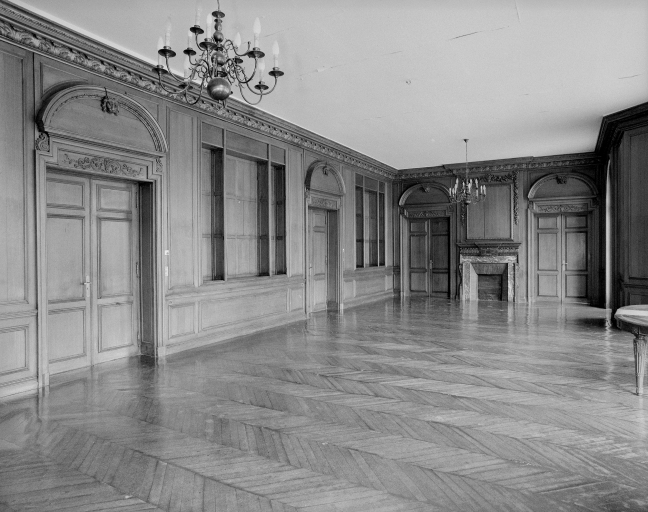 Vue intérieure du grand salon, détail sculpture boiserie.Immatriculation