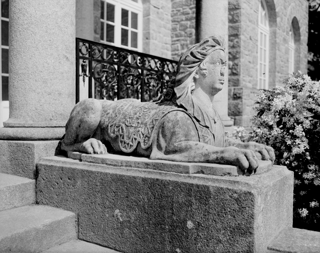Vue générale du sphinx de la rampe de l'escalier d'entrée.Immatriculation