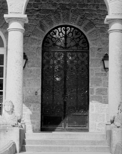 Porte d'entrée du château en ferronnerie et sculptures.Immatriculation