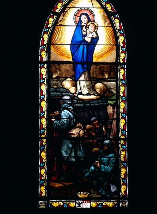 Verrières (9), ex-voto, verrière (verrière à personnages, verrière hagiographique, verrière historiée) : Sainte Famille, Couronnement de Charles VII, Apparition du Sacré Coeur à Marguerite Marie Alacoque, Apparition de la Vierge à Bernadette Soubirous, Délivrance de Saint Pierre par un ange, Saint François de sales enseignant, Education de Saint Louis, Sainte Elisabeth de Hongrie distribuant du pain aux mendiants, Vierge à l'Enfant apparaissant aux poilus dans les tranchées (baies n°4,5,7,9,11,13,15,18,100), église paroissiale Saint-Georges (Châtillon-en-Vendelais),