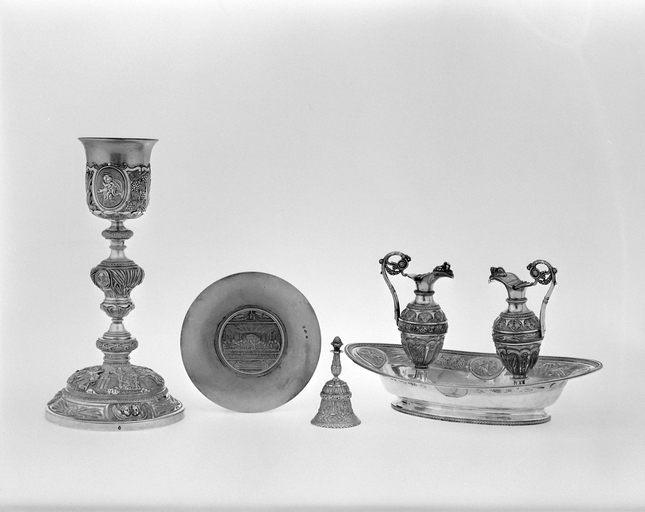 Calice, patène, plateau, burettes - Vue d'ensemble.Immatriculation