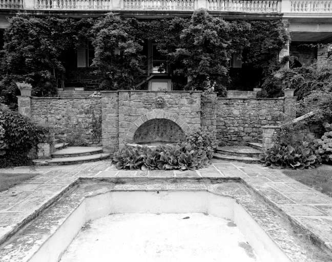 Vue rapprochée du bassin dans le jardin côté mer avec sculpture sur le mur d'enceinte.Immatriculation